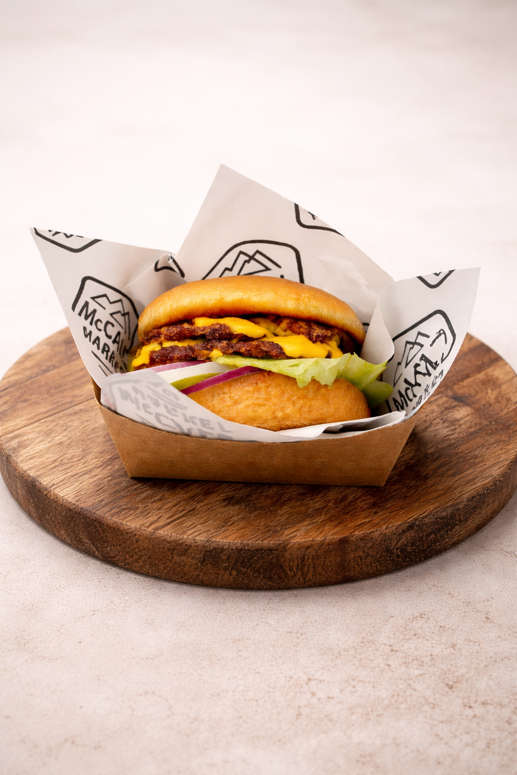 2 burger patties, 2 slices of cheese, Lettuce, Pickles, Onion ring and BBQ sauce